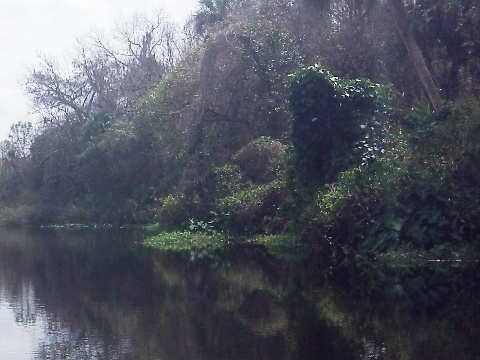 Many turtles, plus alligators and birds. Cypress and oak line the creek; the green kudzu draping the branches create "dinosaur" type sculptures, but unfortunately this is an invasive species.