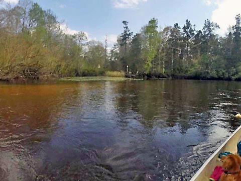 Shown as "King Branch" on the Google map, this side creek can be paddled only a short distance before the cypress knees become too thick, but it provided some of the best scenery along the river - we enjoyed navigating our sit-on-top kayaks as far as we were able. A small, clear streamlet pours out near the start of the creek, we thought it might be a spring.