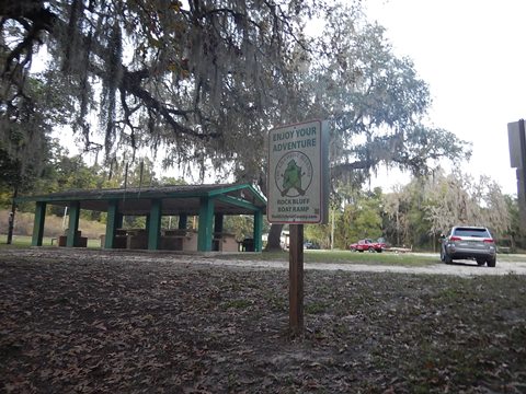 Rock Bluff Boat Ramp on the south side of the river at the CR30 bridge in Bell, FL (across from J. H. Anderson, Jr. Memorial Park). Parking, picnic pavilion, dock. Dixie County facility, no fee.