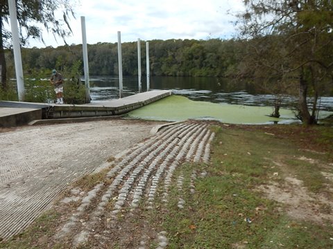 Ivey Memorial Park (no fee) off US 27 in Branford has two boat ramps - the second is the better choice for paddle craft, with a sandy launch area to the side. At normal water levels, the River varies between about 250' and 325' across for about 10 miles downstream to its confluence with the Santa Fe River. The Park has paved parking, porta-potties, picnicking, a dock, and a boardwalk around Branford Spring. Swimming in the spring when the water is high enough.