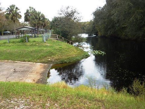 This is a remote corner of Manatee Springs State Park, on the south side of the river. From NW 102nd Place, follow the narrow dirt road to the ramp. From the river, a good rest stop. Parking, picnic. No fee.