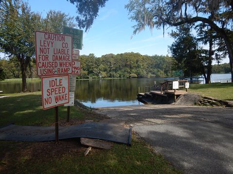 There's no river launch at the park, but worth a visit. Fanning Springs State Park (Park fee applies) has one large spring, other smaller springs, parking, restrooms, camping, picnicking, concession and restaurant, and nature trails. Note: The main spring was once classified as 1st magnitude, sadly flow has diminished and it was reclassified to 2nd magnitude.