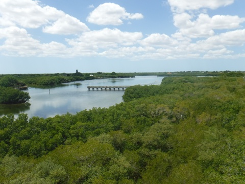 Connected by a paved walkway, there are two long boardwalk loops that weave through the preserve; altogether, about 2 miles of (handicap-accessible) boardwalks and pavement. There are viewing platforms that overlook ponds along the paddling trail. In places, the boardwalk crosses mangrove tunnel. A 45' observation tower offers panoramic views of the preserve and Tampa Bay.